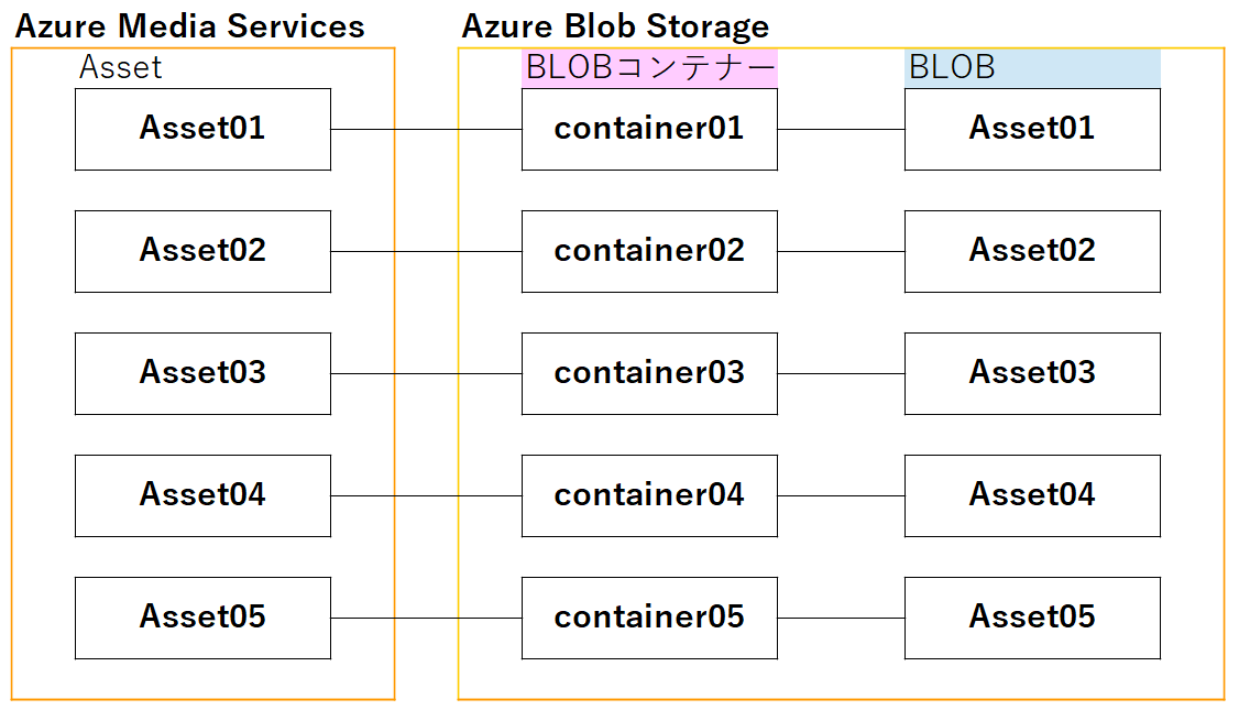 確認したいのは、AssetとBLOBコンテナーが、1:1なのか、多:1でもいけるのかどうかってとこだと思うんよね...