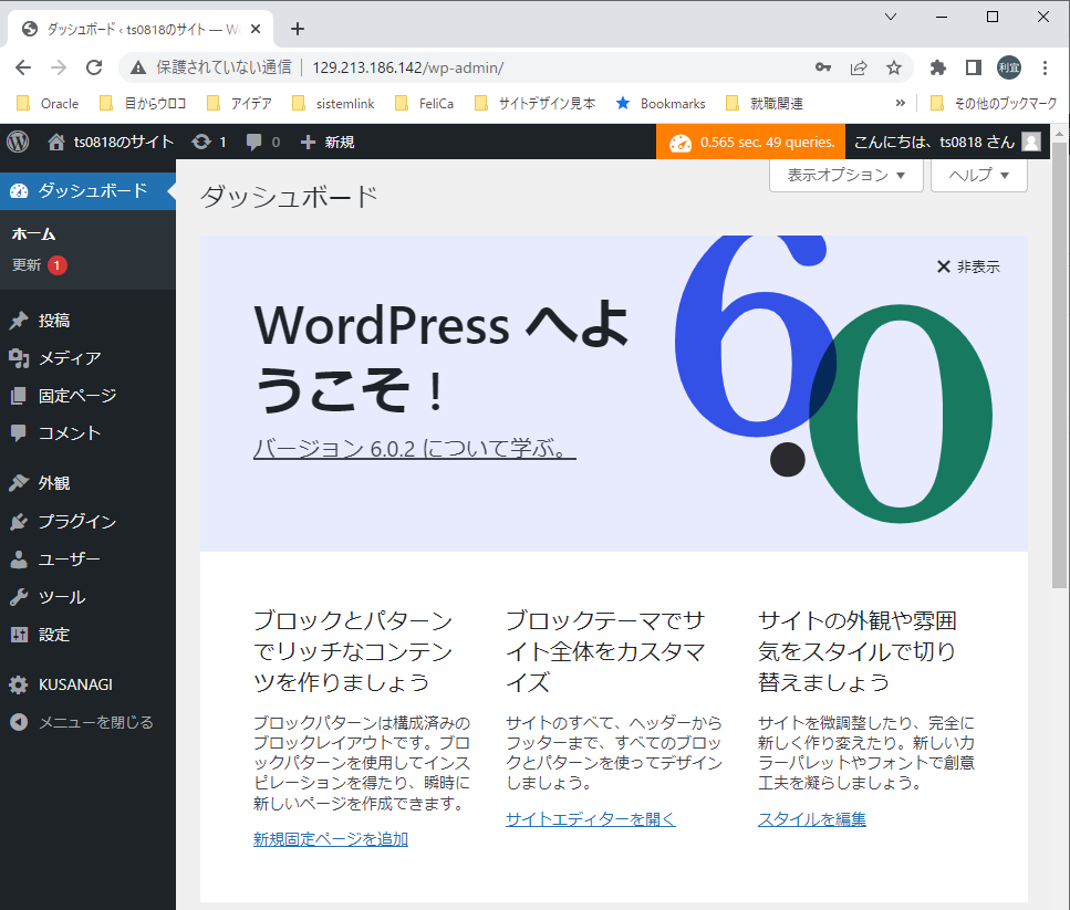 お馴染みの管理画面が表示されてれば、WordPressのインストール成功。