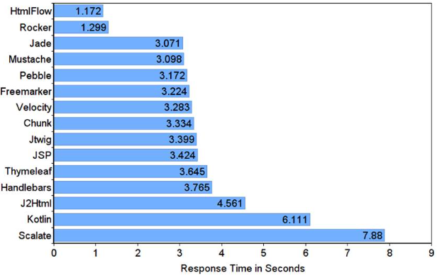 ⇧ 上図のような結果らしく、海外の方のベンチマークの比較で「Velocity」と「JSP(JavaServer Pages)」がだいたい同等の処理速度だったので、「JSP(JavaServer Pages)」は、処理速度的には、やはり可もなく不可もなし的な立ち位置になるんですかね?