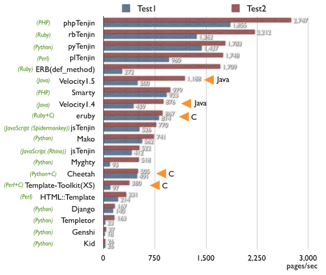 で、2010年頃の情報ですが、他言語のTemplate Engineも含めたベンチマークの比較をしてくださっている方がおられて、