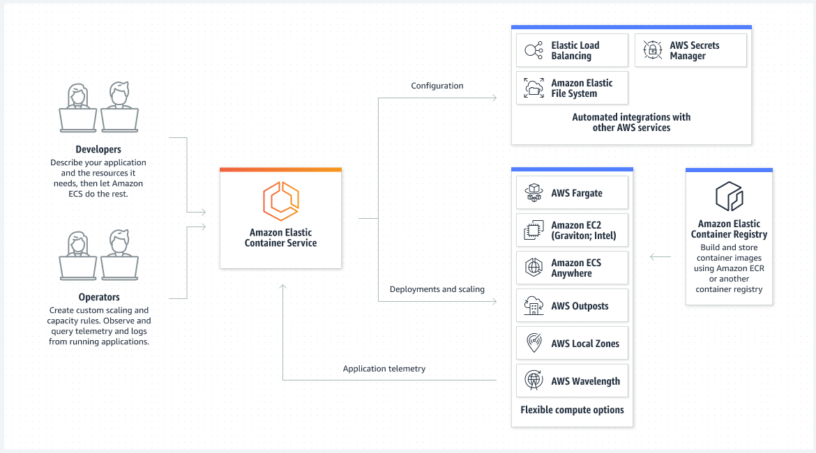 Amazon Elastic Container Service (Amazon ECS) は、コンテナ化されたアプリケーションのデプロイ、管理、スケーリングを容易にするフルマネージドコンテナオーケストレーションサービスです。アプリケーションと必要なリソースを記述するだけで、Amazon ECS が柔軟なコンピューティングオプションで、アプリケーションを起動、モニタリング、スケーリングし、アプリケーションが必要とする他の AWS サポートサービスと自動的に統合します。カスタムのスケーリングルールやキャパシティルールの作成などのシステムオペレーションを実行し、アプリケーションログやテレメトリからデータを確認し、クエリします。