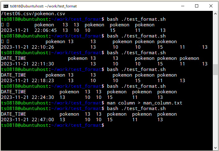 #!bin/bash # 対象のディレクトリ WORK_DIR=/home/ts0818/work/test_format/data header="" body="" LF=$'\n' # CSVファイルの数だけ繰り返し for file in $(find ${WORK_DIR} -type f -name '*.csv'); do # 区切り文字をタブ # header+='\t'"$(basename $file .csv)" # body+='\t'"$(cat $file | wc -l)" # 区切り文字をカンマ header+=','"$(basename $file .csv)" body+=','"$(cat $file | wc -l)" done DATE_TIME=$(date +"%F %T") header="DATE_TIME${header}" body="${DATE_TIME}${body}" # テーブルっぽく出力 echo -e "${header}${LF}${body}" | column -t -s , | tee -a result.text
