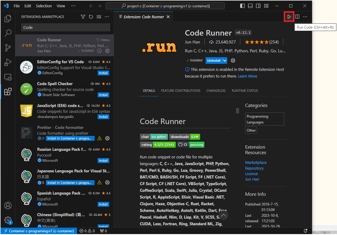 ⇧ 上記サイト様を参考に、コンテナに接続してVisual Studio Codeの方で、「Code Runner」という拡張機能をインストールします。