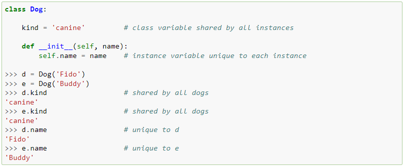 一般的に、インスタンス変数はそれぞれのインスタンスについて固有のデータのためのもので、クラス変数はそのクラスのすべてのインスタンスによって共有される属性やメソッドのためのものです: