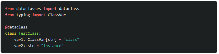 One of the few places where @dataclass actually inspects the type of a field is to determine if a field is a class variable as defined in PEP 526. It does this by checking if the type of the field is typing.ClassVar. If a field is a ClassVar, it is excluded from consideration as a field and is ignored by the dataclass mechanisms. Such ClassVar pseudo-fields are not returned by the module-level fields() function.