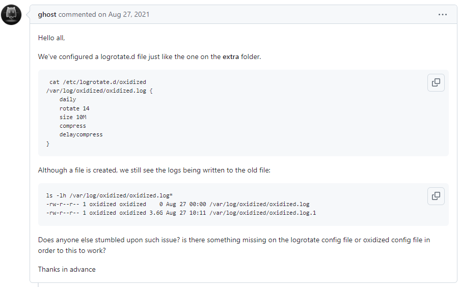 ⇧ 上記のissueによれば、「logrotate」の設定ファイル配置ディレクトリである「/etc/logrotate.d/」配下に「Oxidized」用の「ログローテーション」の設定ファイルを追加すれば良いとあるのですが、「ログローテーション」で新しいログファイルに切り替わらないって仰っておられるのですが、解決策を提示せずにissueがクローズされているという...