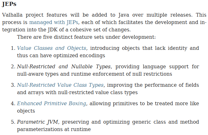 | 1 | Value Class | 401 | https://openjdk.org/jeps/401 |