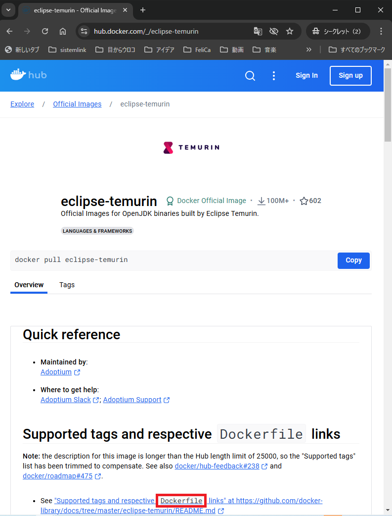 「Docker Hub」が公開している「OpenJDK」のDockerイメージのページから、