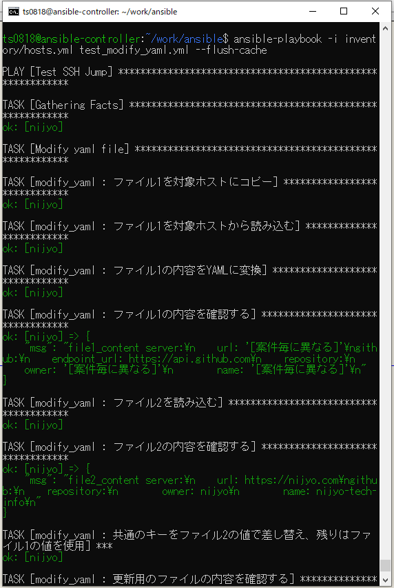 /home/ts0818/work/ ansible/ ├── inventory/ │ ├── group_vars/ │ │ └── all.yml │ ├── host_vars/ │ │ └── nijyo │ │ ├── config.yml │ │ └── nijyo.yml ├── roles/ │ └── modify_yaml/ │ └── tasks/ │ └── main.yml ├── test_modify_yaml.yml └── test_ssh_jump_playbook.yml app/ ├── config/ │ └── config.yml └── src/