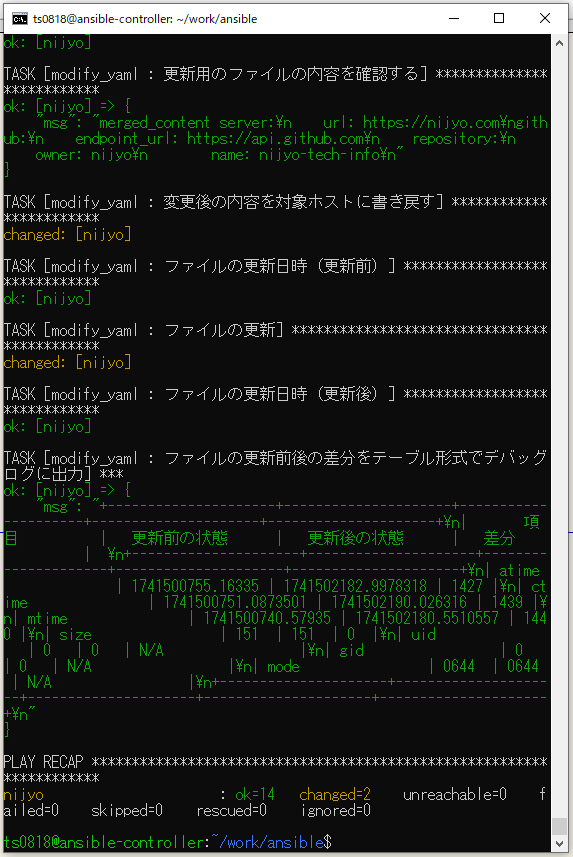 - name: ファイルの更新前後の差分をテーブル形式でデバッグログに出力