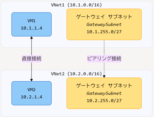 - 黄色のボックスはゲートウェイサブネットを表し、VNetピアリングの設定に使用されます。