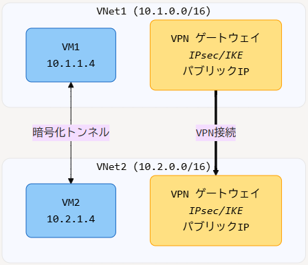 - 黄色のボックスはVPNゲートウェイで、IPsec/IKEプロトコルによる暗号化接続を確立します。