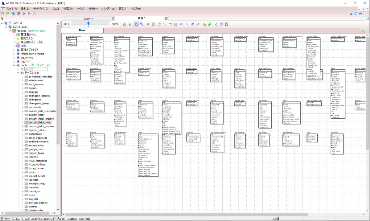 ⇧ 上記の記事で、「DDL」を作成して、「Redmine」で利用されている「データベース」の「テーブル」一覧を確認しましたと。