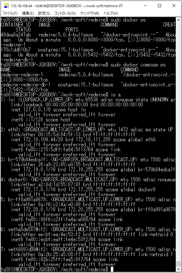 前回の時に用意しておいた「docker-compose.yml」の配置されているディレクトリに移動して、「Docker Compose」環境を構築。