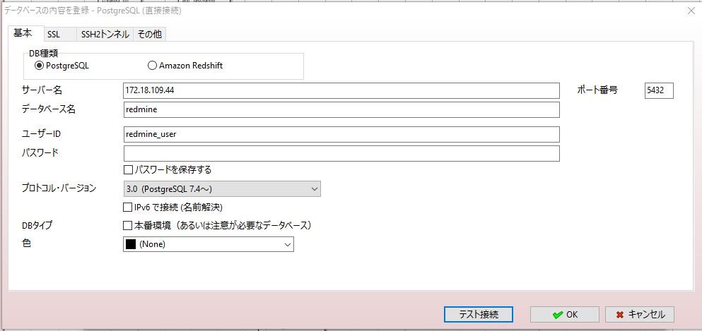確認しておいた「IPアドレス」を「サーバー名」に設定。その他の値は「docker-compose.yml」に記載の値を設定。