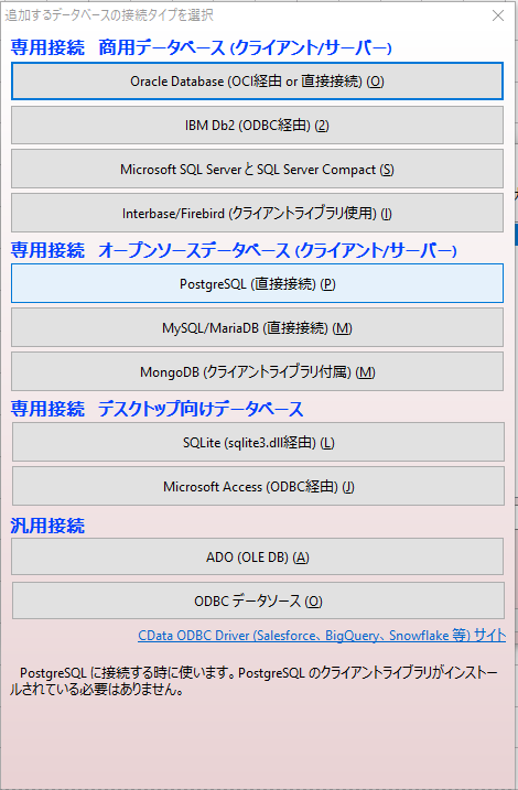 「PostgreSQL(直接接続)(P)」を選択。