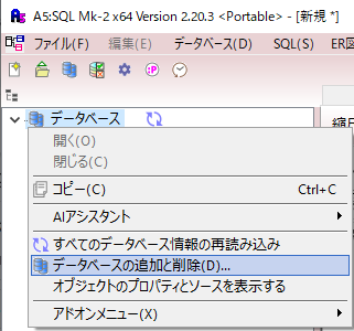 「A5:SQL Mk-2」を起動し、「データベース」上で右クリックし「データベースの追加と削除(D)...」を選択。