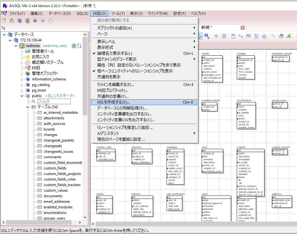 ただ、「ER図(D)」が選択できるようになるので、「DDLを作成する(D)...」が選択できて、