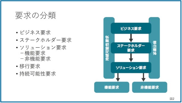 ⇧ 上記サイト様で紹介されている「ビジネスアナリシス知識体系ガイド (BABOK:Business Analysis Body Of Knowledge)」によると、「要求」は分類されているということらしい。