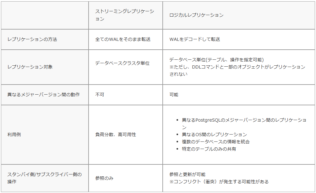 あと、「PostgreSQL」のバージョン毎で利用できる「レプリケーション」の方式を「ChatGPT」氏に質問してみたところ、以下のような回答が返ってきた。