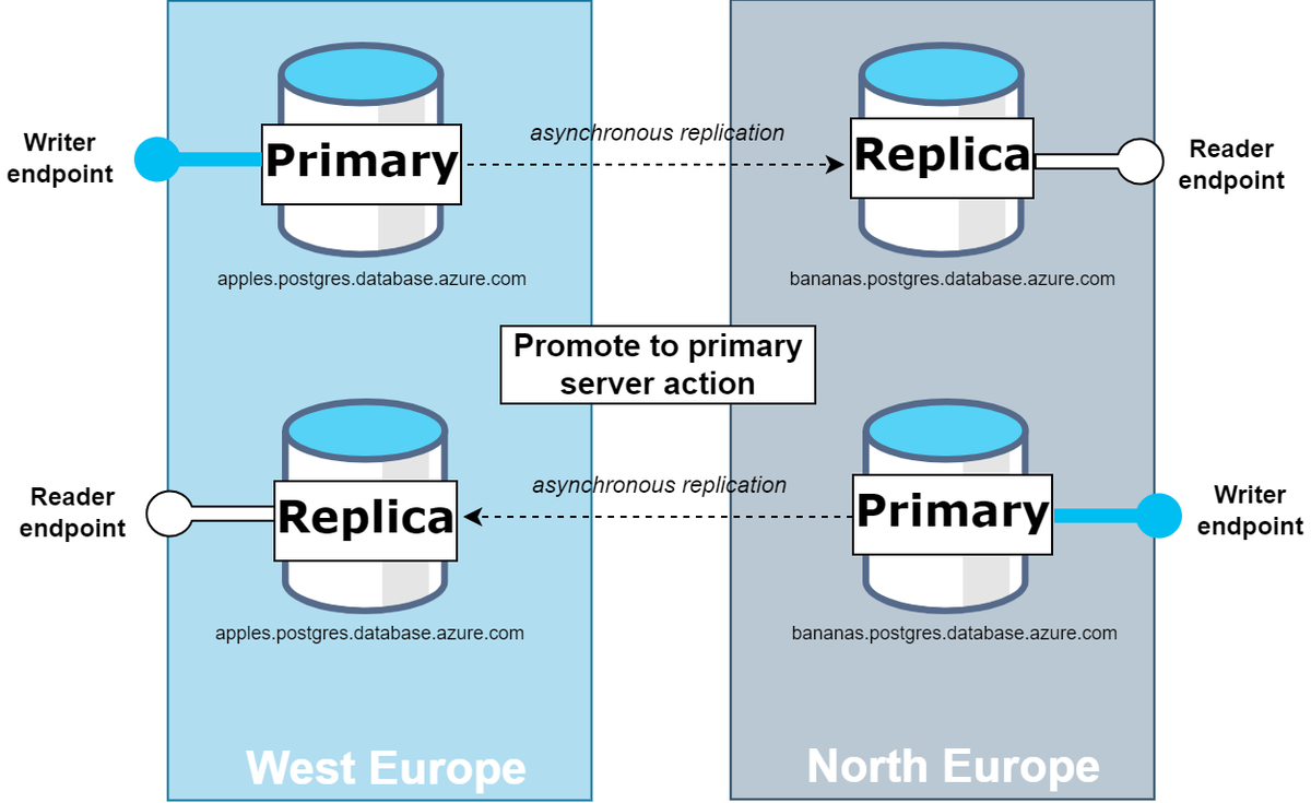 このアクションにより、レプリカがプライマリ サーバーのロールに昇格されます。 このプロセスでは、現在のプライマリ サーバーがレプリカ ロールに降格され、ロールが入れ替えられます。 昇格が成功するには、仮想エンドポイントが、現在のプライマリに対してライター エンドポイントとしてと、昇格の対象となるレプリカに対してリーダー エンドポイントとして、両方に構成されている必要があります。 昇格は、対象のレプリカがリーダー エンドポイント構成に含まれている場合にのみ成功します。