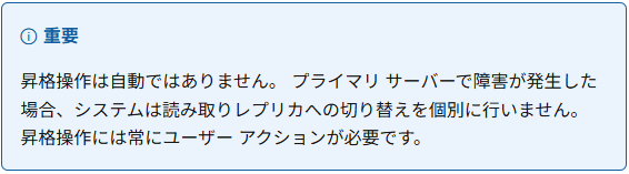 『昇格操作は自動ではありません。 プライマリ サーバーで障害が発生した場合、システムは読み取りレプリカへの切り替えを個別に行いません。 昇格操作には常にユーザー アクションが必要です。』