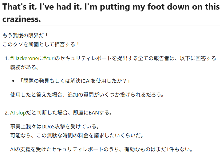 AIによる無効なバグレポートが、Curlのバグ報奨金プログラムに殺到。「事実上、DDoS攻撃を受けているようなものだ」と開発者が訴え - Publickey