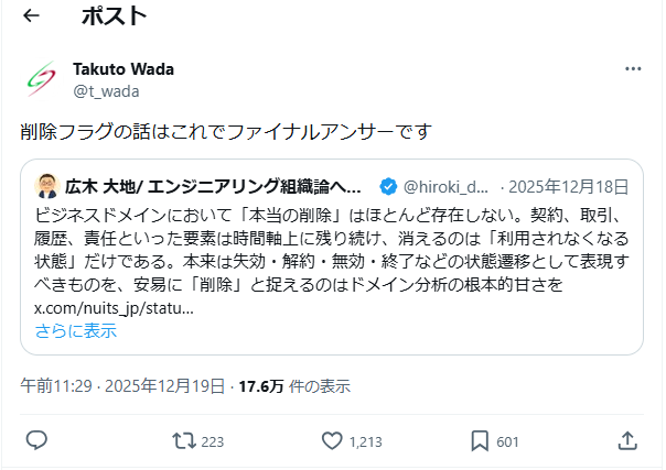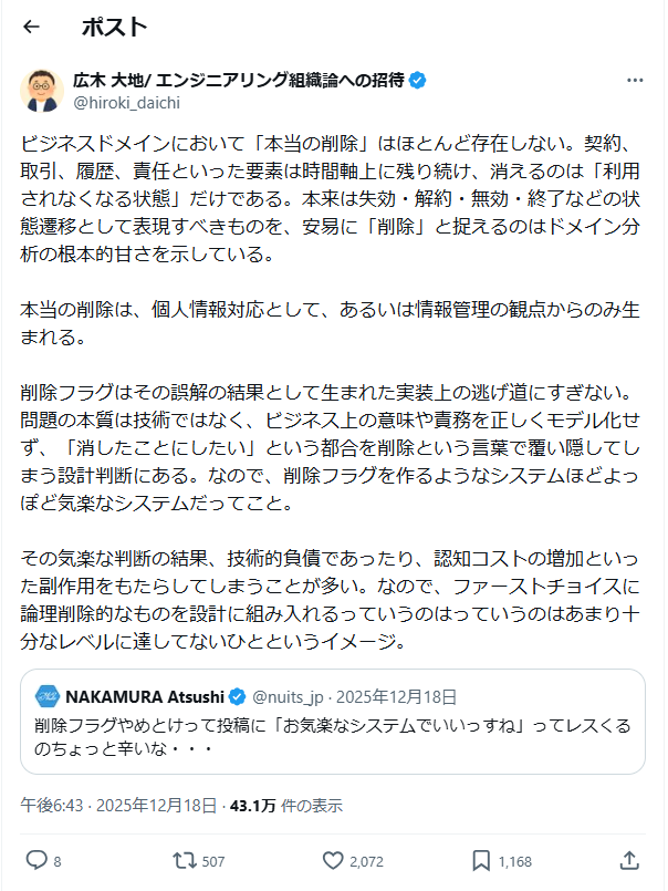 『削除フラグはその誤解の結果として生まれた実装上の逃げ道にすぎない。』